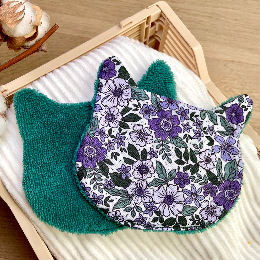 Adoptez le Chaton démaquillant, la solution toute douce pour dire adieu aux cotons jetables grâce à sa face en coton imprimé et sa face en éponge de bambou ultra-douce.